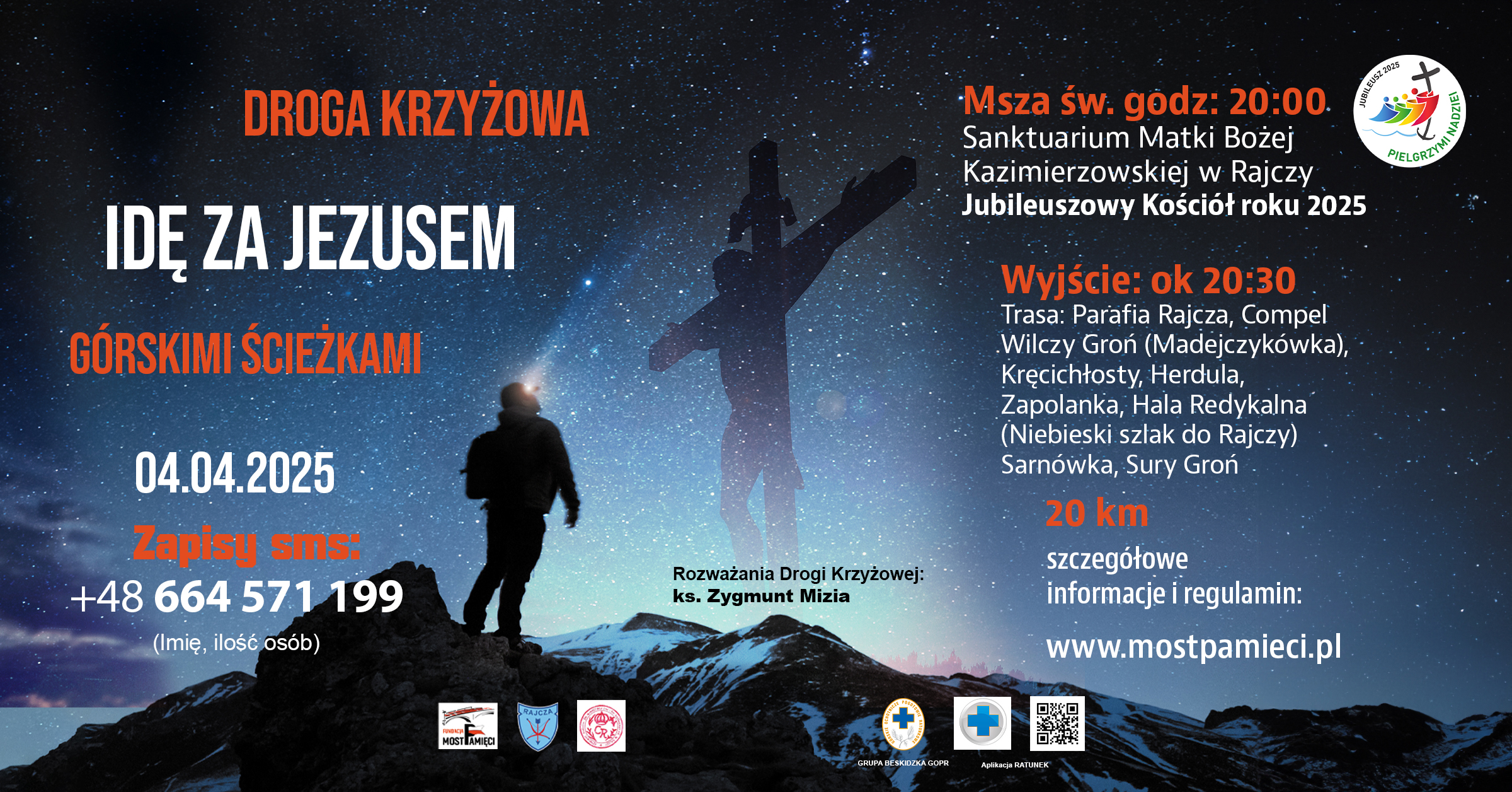 Zapraszamy do udziału w Drodze Krzyżowej górskimi ścieżkami „Idę za Jezusem”, która wystartuje w piątek 4 kwietnia 2025 roku. Rozpoczynamy Mszą św. w Sanktuarium Matki Bożej Kazimierzowskiej w Rajczy (Jubileuszowy Kościół roku 2025) o godz. 20:00. Po Mszy św. wyruszamy w trasę (ok godz. 20:30), która ma długość 20 km. Rozważania w czasie trwania Drogi Krzyżowej poprowadzi ks. Zygmunt Mizia – proboszcz parafii Miłosierdzia Bożego w Miliardowicach.